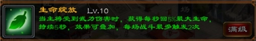 生命绽放,回复型技能,满级后在主将收到武力伤害时获得每秒5%最大生命值的回复,持续5秒。每场战斗能出发两次。变相为武将提升了25%的血量,但应对智将无用,一般都需要被小兵攻击后触发。应对场合较多,是比较万金油的一个技能。