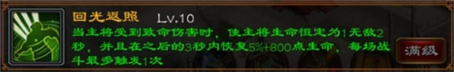 回光返照,这个技能就是杨威将军作为第一副将的理由所在,信春哥,得永生,原地复活不要更爽!在主将受到致命伤害的时候获得2秒无敌,并在3秒内回复5%+800的生命值。从此再也不怕被秒杀了!绝地反攻再也不是梦!