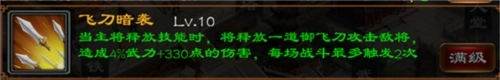 飞刀暗袭,伤害型技能,满级后效果在主将释放技能的时候给予对方4%武力+330点的伤害,每场战斗最多触发两次。伤害相交冰爆稍低,但贵在能主动释放,相当于头两次所有技能都都附带了额外的伤害,适合追求秒人的武将使用。