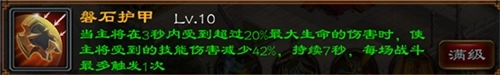 磐石护甲,防守型技能,满级后效果为当主将在3秒内收到超过20%时,使主将受到的技能伤害减少42%,持续7秒。每场战斗最多触发1次。这个技能要注意,第一次超过20%的伤害是不算在技能伤害的见面里面的,所以这个技能并不能阻止秒杀型技能,而且就算受了一个秒杀型技能后还没死,估计也差不多了。所以这个技能实用性也不大。