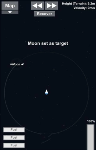 点击喷射器即可启动发动机,点击“off”和“on”按钮能控制燃料的关闭与开启;滑动操作可以增大推力,但燃料消耗也会随之加快。现在,跟着箭头的指引,向着月球出发吧。