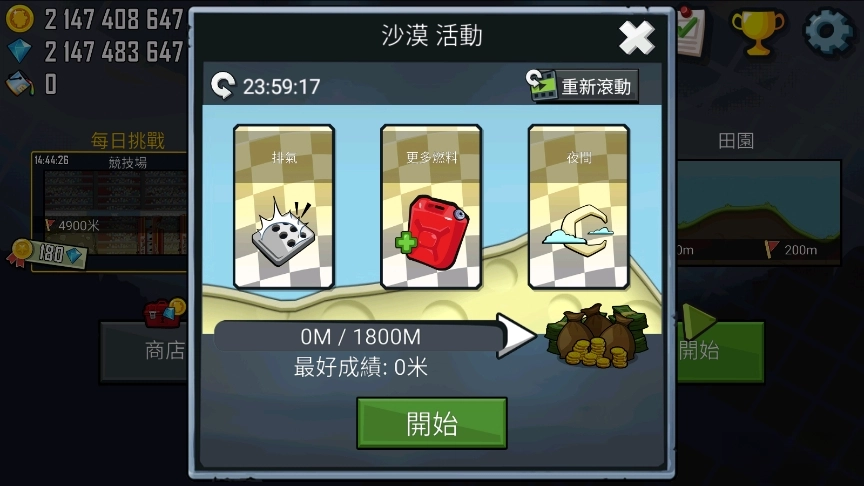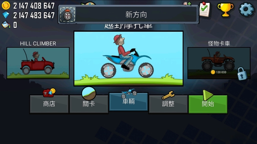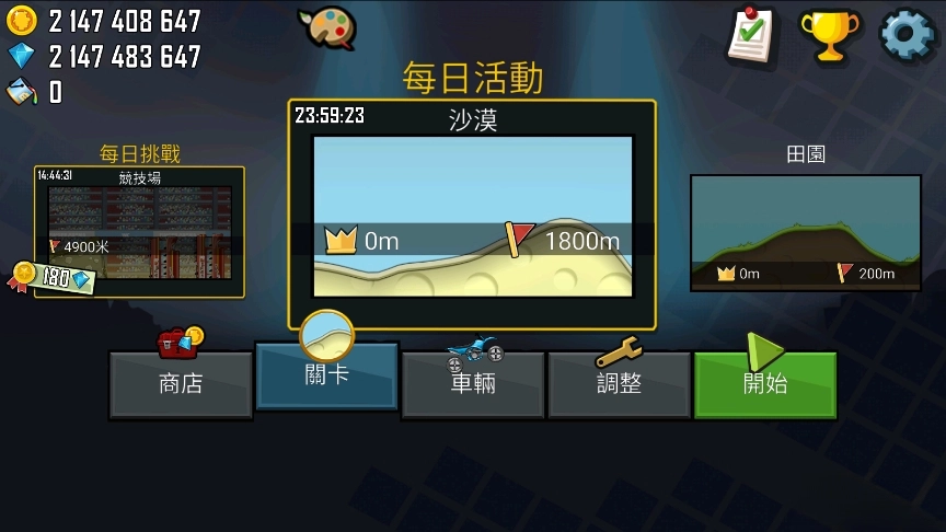 游戏会记录玩家在每个关卡达到的等级与最远行驶距离,玩家可用赢得的奖金在车辆选项中更换新车。作为一款小游戏,车辆种类自然不会太丰富,总共只有三辆——一辆普通吉普车、一辆大轮越野车,还有一辆外观稍显酷炫的跑车。另外,玩家还能升级车辆的四大核心部件,以此提升车子的驱动力、弹跳能力与平衡性,力求挑战更远的行驶距离!