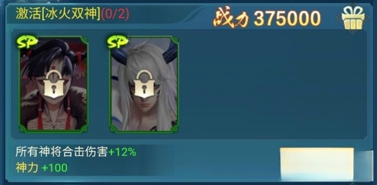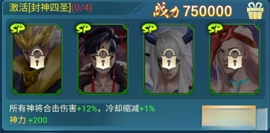 属性:全体神将合击伤害提升12%,冷却时间缩短1%,神力增加200点