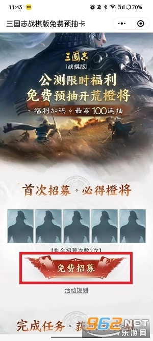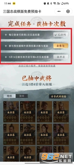 《三国志战棋版》的预抽卡活动可通过微信小程序参与,玩家每日在线抽卡有机会获取橙卡与紫卡,这些卡牌能在活动期间进行兑换,待游戏开启测试后,便可领取对应的武将。
