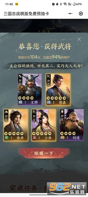 4、抽卡后可以获得五位武将,包含橙将、紫将;
