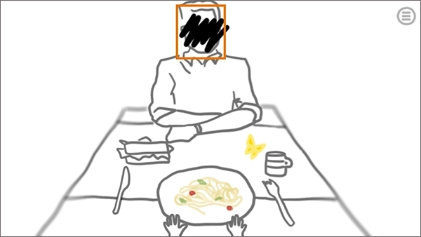 然后点击它的脸部区域,让它的面容逐渐显现出来(也就是变得清晰一些,不用纠结细节)。首先引导蝴蝶飞到男人的肩膀上,这样他的脸就会出现;接着再点击蝴蝶,让它飞到那个叫不上名字的东西(可能是三明治)的上方,之后让蝴蝶带动这个东西移动到杯子附近,并调整成向下的状态。(不用问为什么没有肩膀和三明治的图片,实在是截不动图了)