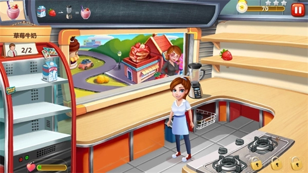 2、屏幕左上角会出现菜单提示,说明顾客所需菜品的制作方法,比如图中的饮料,需将牛奶和香蕉放入榨汁机即可制成。