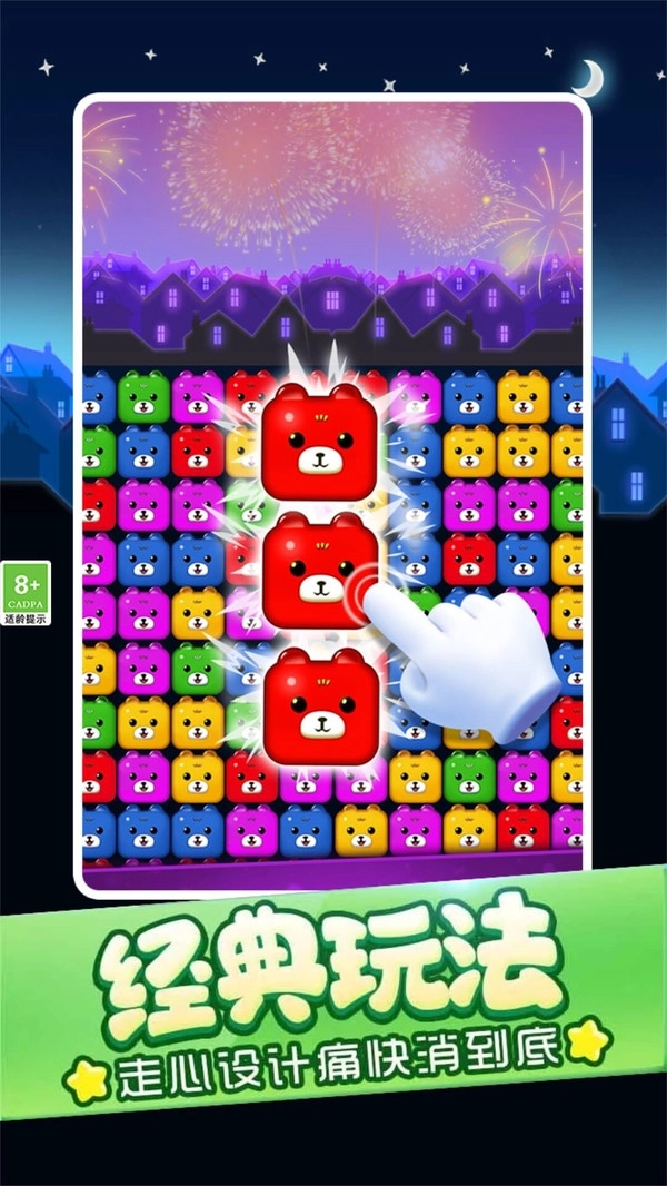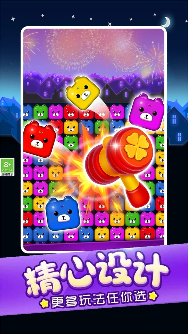 玩家能够在游戏里和好友分享自己的分数与成就,也可以向好友的分数发起挑战,角逐最高分榜单的名次。《萌熊碰碰消》有着可爱的方块元素,消除闯关的乐趣不间断,期待大家来体验!