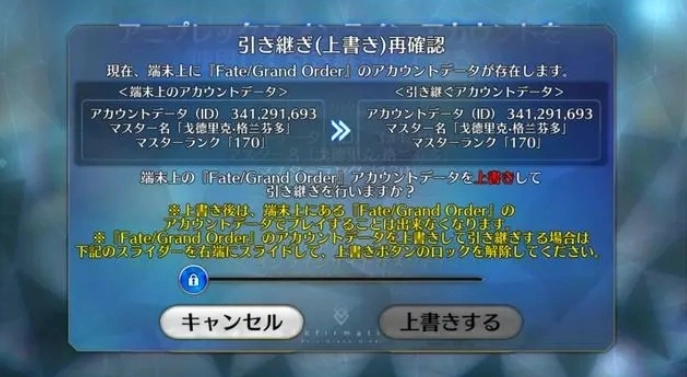 填好之后会向你的邮箱发送验证码,登录自己的邮箱将验证码填进去,然后点击下方确认,跳回游戏界面,在这里会让你滑动解锁,确认覆盖当前数据,切换到你想登录的这个账号。