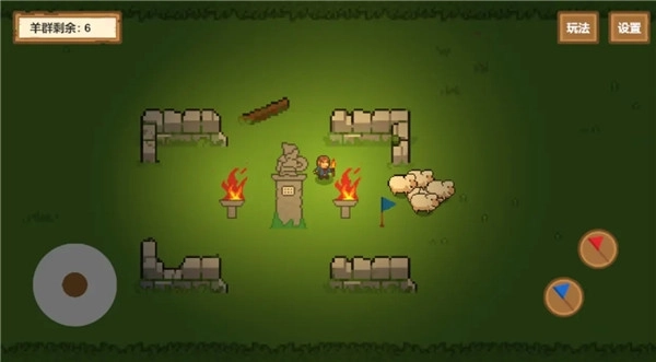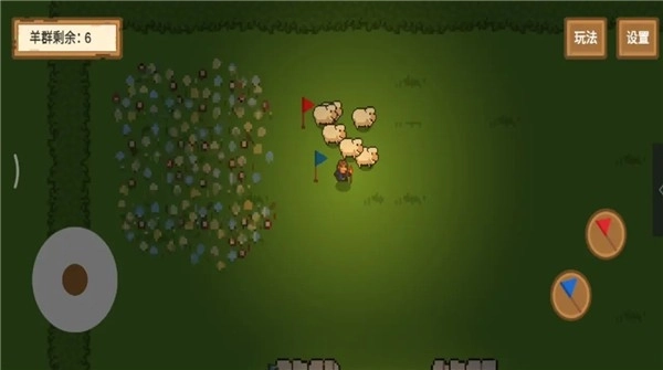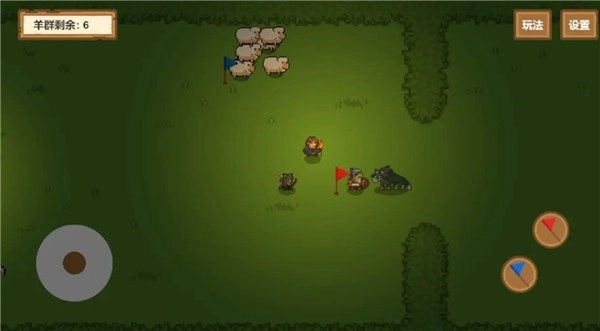 1、玩法机制类似于平面动作游戏,通过摇杆操控主角的行动,插旗的操作则能指令队友或羊群移动。