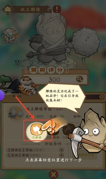 1、雕像的灵力凝聚成了一把石斧!它正指引我去收集木材!只需点击就能完成木材收集了。