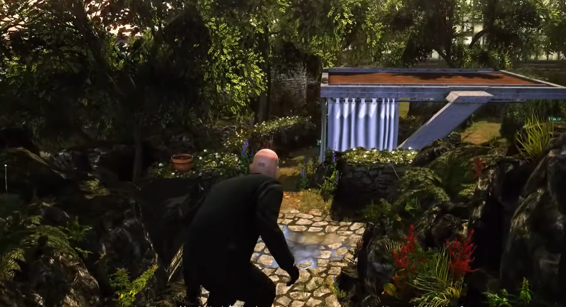 本作新增了掩体机制。藏在树干后方,用消音手枪解决掉第二名守卫,再把尸体塞进垃圾桶里。接着往前走,网球场那边有个正打电话的守卫,你可以选择用钢丝勒死他,或者悄悄绕开。再向右拐走下石阶,解决第四名守卫后将尸体拖到角落。转角处设有存档点,记得手动保存进度。