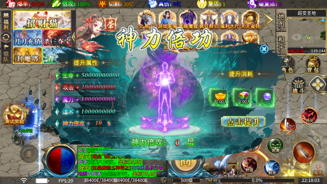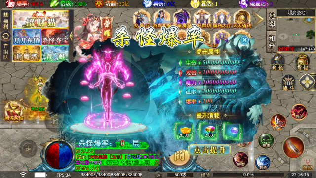 杀怪爆率:消耗元宝、钻石和远古明珠就能提升,不仅能获得大量攻魔道属性,还能提高打怪爆率。