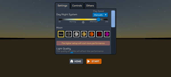 3、随后对地图中月亮的颜色、亮度等进行调整,完成设置后,点击“start” 。