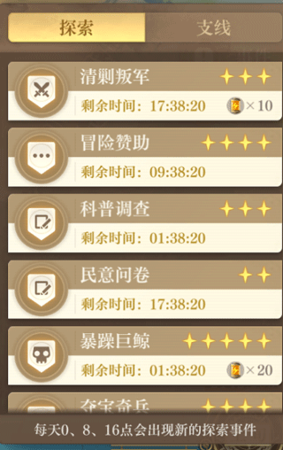 事件的刷新时间是每天的0点、8点和16点,每天会随机刷新三次。建议大家每天把所有事件都刷完,这样能获得不少资源,主要包括源晶、面包、邀请函这些;要是事件只有银币奖励,那就可以根据情况选择不做。