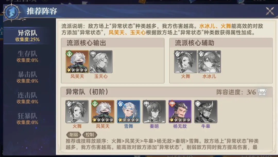 在时空召唤界面,系统为大家推荐了不同流派,每个流派都包含核心辅助、输出以及各阶段的构筑思路。建议大家留意这部分内容,后续可根据抽到的核心魂师来搭建对应的队伍(作为后期养成队伍的方向)。新服初期,由于魂师数量有限、练度也不够,所以不必严格按照流派来组建队伍,本文也会提供通用的队伍构筑方案,帮助大家顺利开荒。