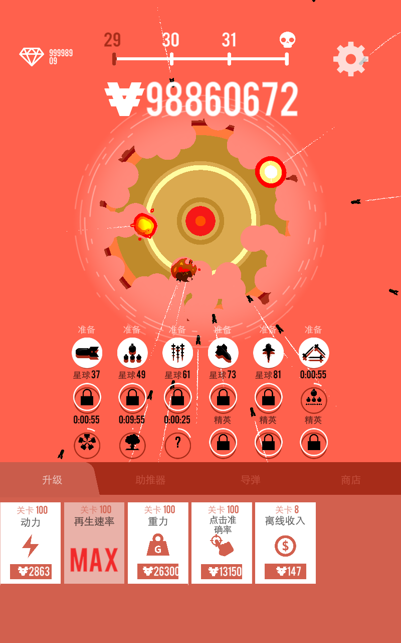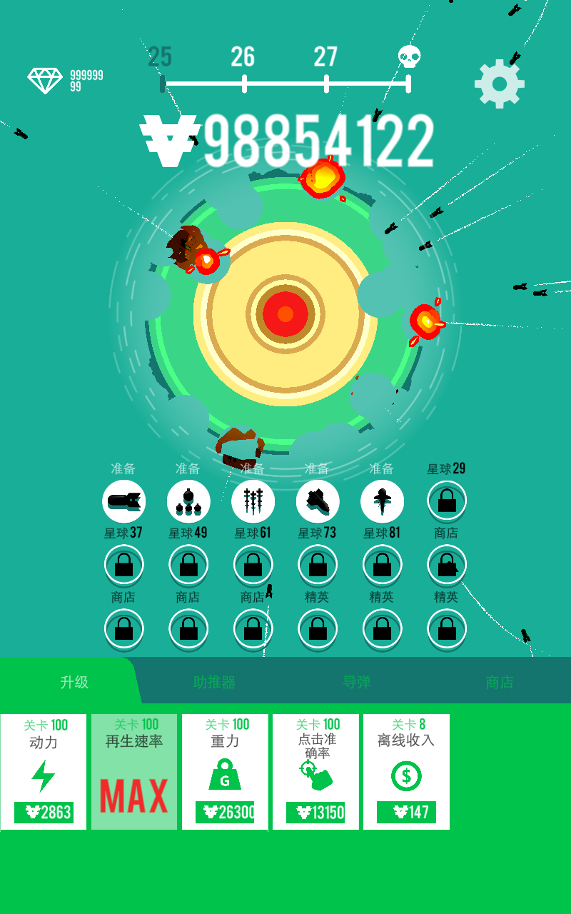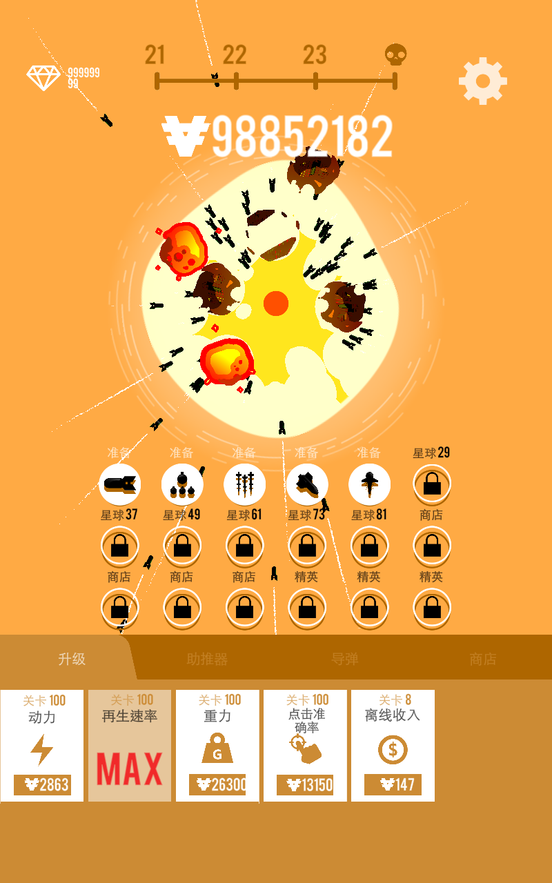 Bomber是一款像素风格的趣味闯关游戏,操作十分简单,只需点击屏幕升级技能就能轻松挂机游玩。每一关都有多种怪物等待挑战,你可以通过提升导弹的威力与穿透力来增强战力,整体难度不高,还能借助已解锁的技能轻松击败敌人。