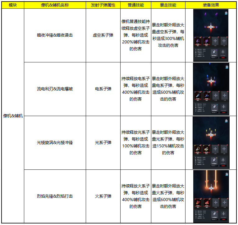 僚机与辅机:僚机在战机前半身的左右两侧,辅机则处于机身后半身的左右两侧,这两个模块的主要作用是弥补战机子弹属性的不足,它们发射的子弹属性和攻击不受战机影响,主要和自身的星级与等级相关。