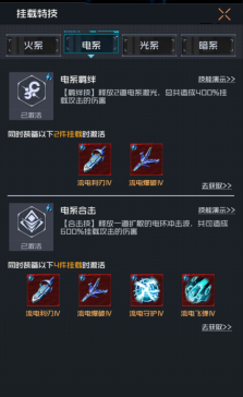 电系挂载特技介绍:同时装备流电利刃和流电爆破激活电系羁绊技能:持续释放2道电系激光,总共造成400%挂载攻击的伤害。