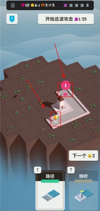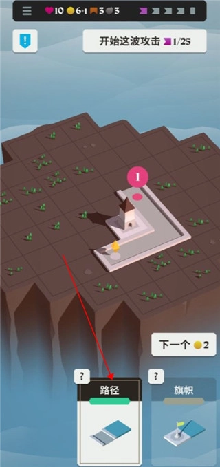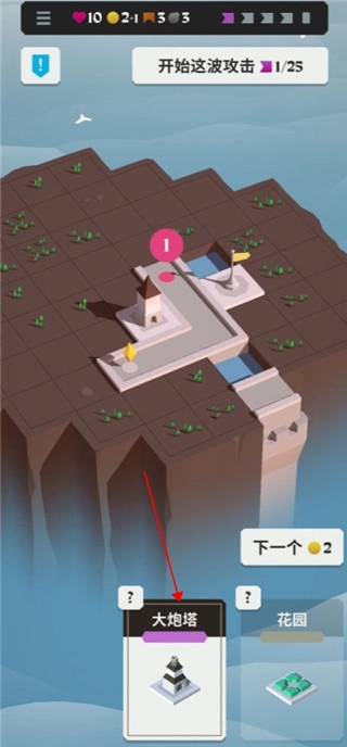 点击旁边的“下一个”按钮,选择炮台并将其部署在防御路径上,以此消灭敌人。