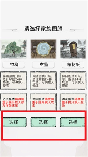 接下来是家族图腾,共有三个,分别为玄鉴、棺材板和神柳,任选其一即可。