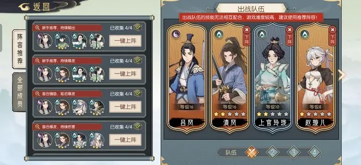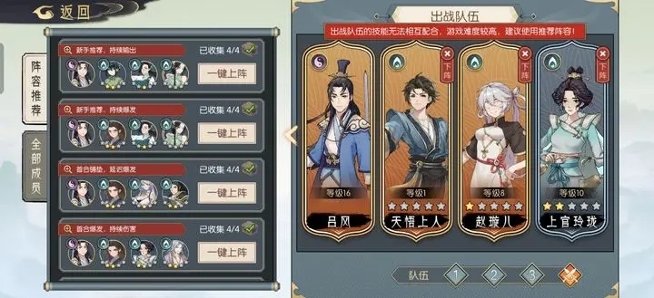 第一套阵容【轮回断水队】:萧无涯、慕容月、天悟上人。操作方式为使用三清化水符提升威能后,释放轮回断水技能。这套阵容输出能力强劲,适合应对单体类型的怪物。