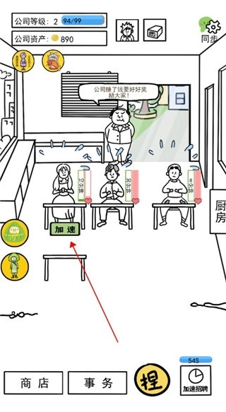 员工入职后,玩家可借助加速功能提升他们的工作效率。(这堪称经典的压榨操作)