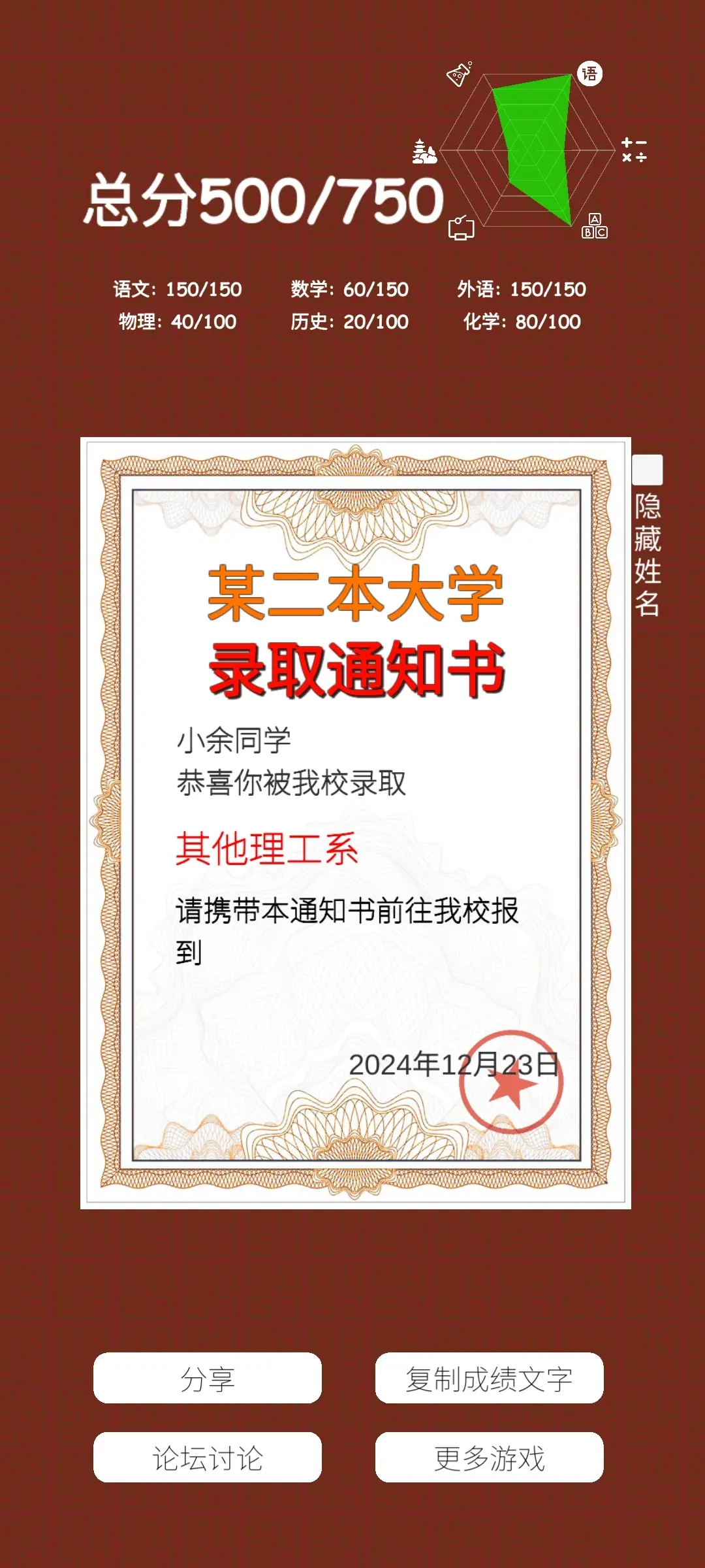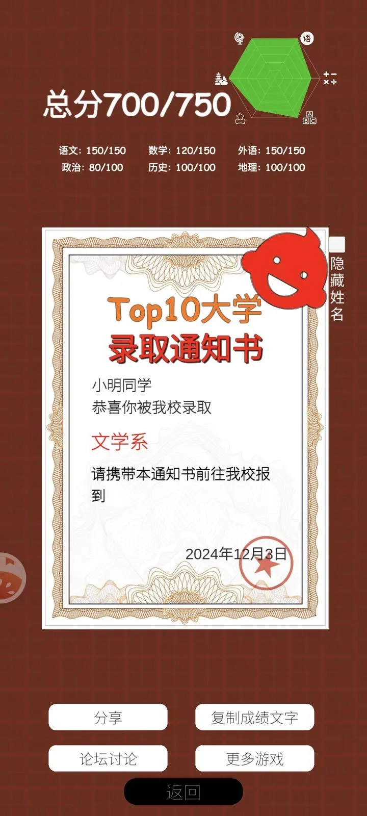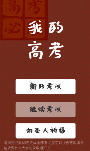 这是一款能帮你找回青春、填补遗憾的模拟游戏——试想一下,要是有这么一款游戏能让你弥补高考的遗憾,你会选择玩吗?游戏里设置了三种不同的模式供玩家挑选,不同模式对应着多个不同的考试科目选项。游戏中的题目难度不算高,但也融入了不少高考真题,能让玩家体验到比较真实的高考模拟感。