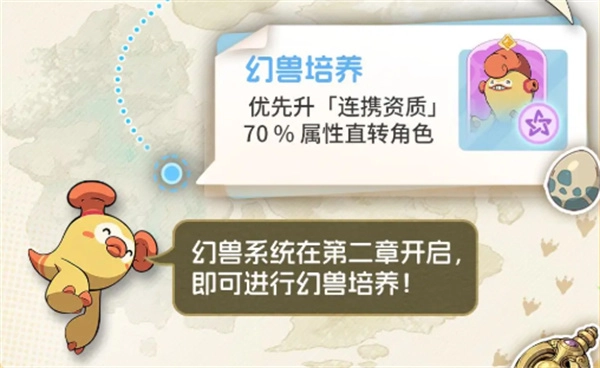 幻兽分为水火草电四个属性,彼此之间存在克制关系,推进关卡时要记得替换上阵能克制Boss的幻兽。建议优先提升「连携资质」,因为它能将70%的属性加成转移到角色身上。