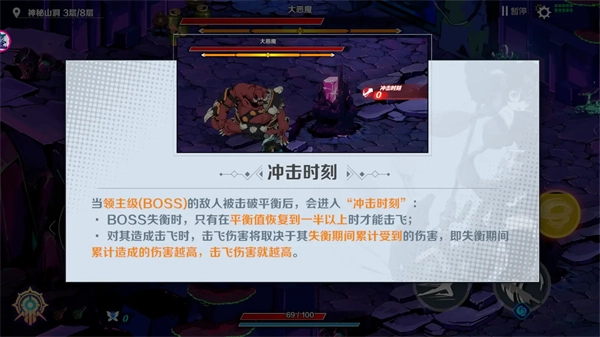 战斗机制说明如下:当怪物血条上方的平衡值累积满时,怪物会进入失衡状态,此时使用魂技将其击飞,若怪物撞击到墙壁还能产生额外伤害。而BOSS的失衡机制有所不同,需要在其失衡值填满后,等平衡值恢复至一半时再进行击飞操作,且击飞造成的伤害与BOSS在失衡状态下受到的总伤害成正比例关系。