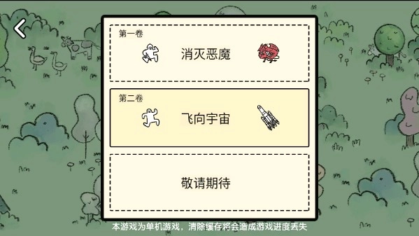 点击开始游戏后,我们可以选择两个剧情进行体验,第一卷“消灭恶魔”和第二卷“飞向宇宙”的游戏难度是一样的,只是剧情任务存在区别。