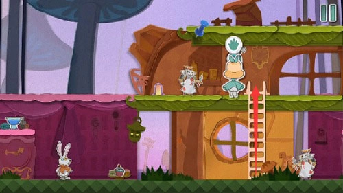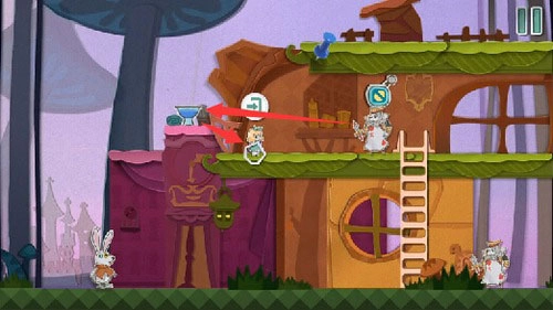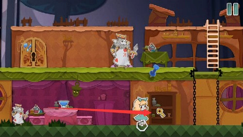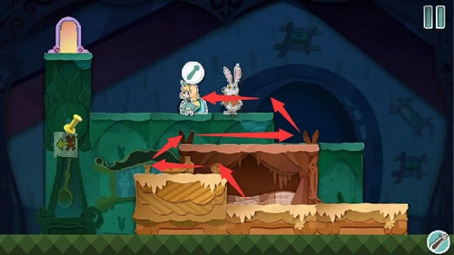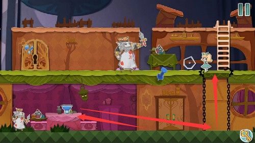 把黄色场景往右边拖动,使变小药水和变大蛋糕重叠,用钥匙打开门后,扑克兵就会喝下变小药水,变成最小的样子。