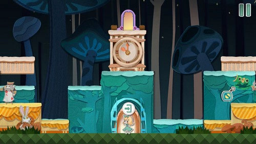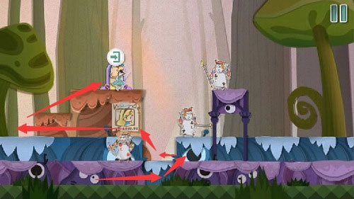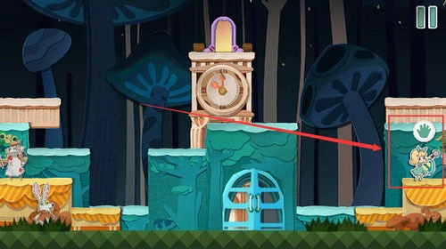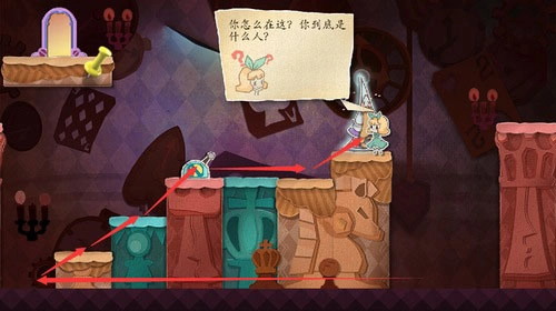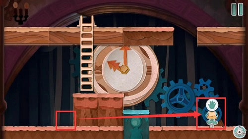 按照图中的指示移动方块,把扑克兵困在屏幕的另一边,接着拉下操纵杆就能打开时钟塔的门了。