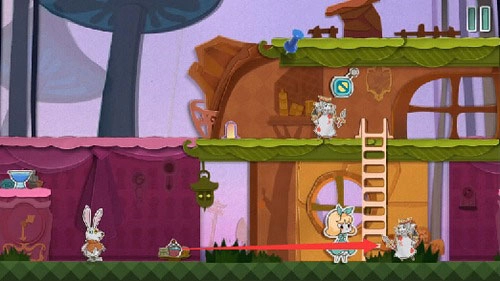 站到青色方块上,把红色场景向左移动,把老鼠驱赶到高台外面。