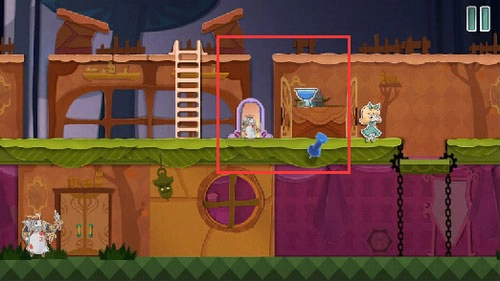 顺着梯子向上爬,按下拉杆将变小药水的方块抬高。