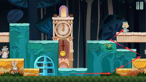 踩着青色方块垫高,走进时钟上方的门就能成功通关。