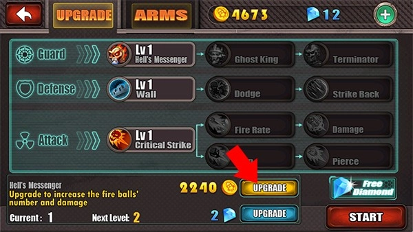 接下来选择我们想要升级的技能,然后在下方选择使用金币或者钻石升级中的一种,点击其后的Upgrade按钮就可以了。