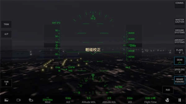 选择好机型后,只需点击“开始起飞”按钮,就能进入正式的飞行界面。进入该界面后,首先要完成校正步骤,这一环节正是对真实飞机起飞前校正场景的模拟。