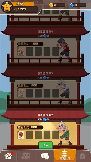接下来就能挑战声望塔,赢取更丰厚的奖励,解锁更强力的武功了。