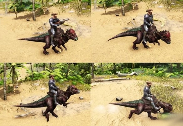 被驯服后的肿头龙,血量、负重和耐力都稍显偏低,移动速度也比较缓慢。它的鞍具在14级时解锁,骑乘状态下可以使用武器,鼠标左键可用于攻击与采集。其攻击方式与野生状态时一致,能附加眩晕值(数值和自身伤害量相近),还能采集少量木头和茅草,但无法采集草丛。另外,它也需要玩家亲自采集浆果来喂食。