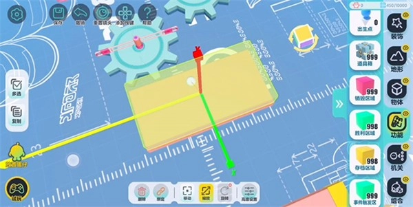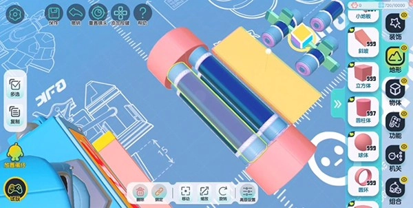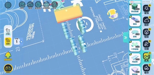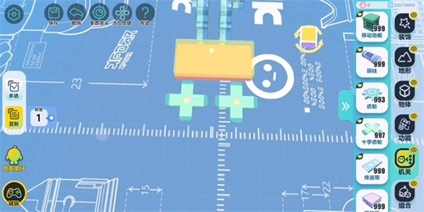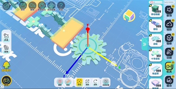 为了操作更便捷,在正式着手搭建之前,要把设置里的编辑视角切换成【上帝视角】。在机关选项中找到“齿轮”组件并拖拽出来,就能完成“齿轮”摆放的基础操作。除了常规的摆放方式外,还能点击【旋转】按钮让“齿轮”竖立起来,也可以通过调整【缩放】参数来改变“齿轮”的整体大小和侧面宽度。等尺寸调整合适后,点击左侧的【复制】按钮,就可以批量复制已经调整好的组件,这样能起到节省时间、提升效率的作用。