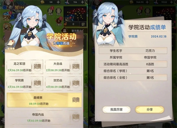 模拟战的荣誉值以及在模拟战中占领的城池,都会被纳入学院综合分的计算范畴以展开比拼。为了提升学院的总分,需要选拔出具备更强领导力的领袖、执政官与元老,携手推动学院发展壮大。领导层既能够借助[公告]来调度兵马,也需通过科学分配[福利]来凝聚人心。