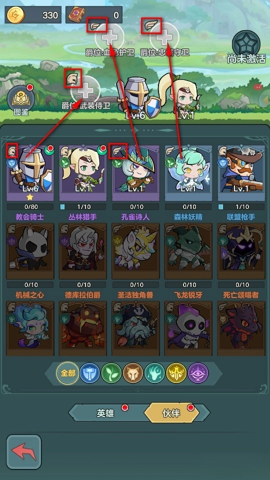 接下来我们要留意伙伴的职业类型,再挑选对应的伙伴安排上阵到指定位置——伙伴左上角的图标,和可上阵的伙伴位置是对应的。