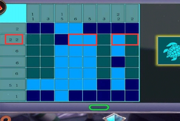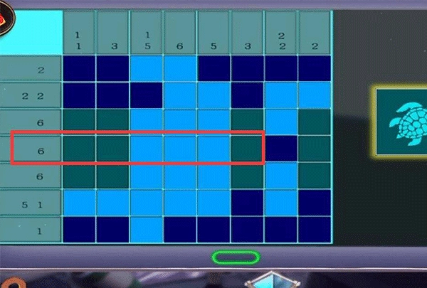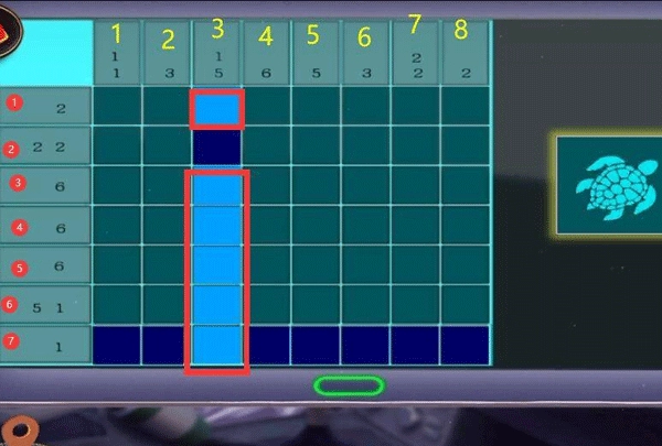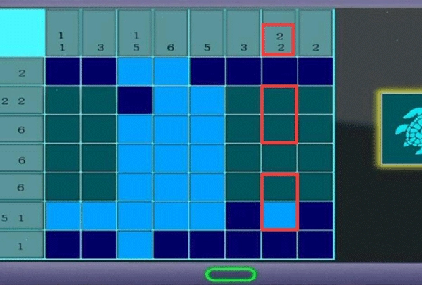 第二列的数字是3,意味着要让三块瓷砖连续亮起,由于第四块和第六块瓷砖已经固定处于亮起状态,所以只能选择点击第五块瓷砖。再看第八列,数字是2,需要让两块瓷砖连续亮起,因此点击第八列的第三块瓷砖就可以了。