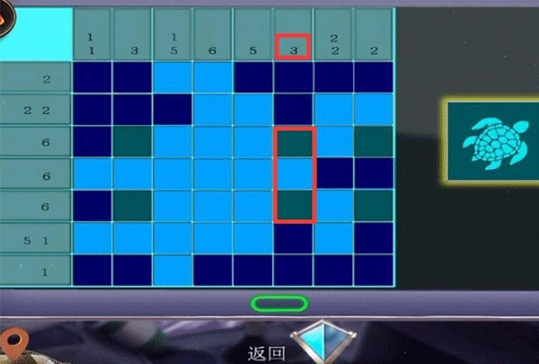 再依据第六列的数字为3,此时仅剩下两个格子可供点击,只需点亮剩余的第三格与第五格的瓷砖就行。