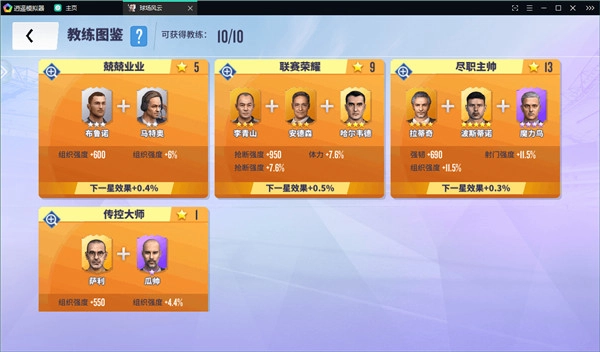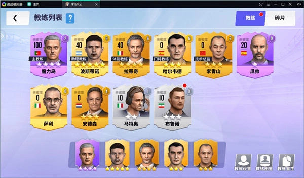 首先要明确,教练是提升球队战力的核心途径,所以大家一定要优先把教练系统搞定,球员带来的战力提升和教练相比完全不在一个量级。接下来进入正题,点击进入教练页面后,会看到教练列表展示你教练组的所有成员。目前游戏内有穆尼尼奥、瓜迪奥拉两位紫卡教练,三位闪金教练,三位金卡教练,以及两位银卡教练。紫卡教练和大部分闪金教练主要通过教练嘉年华活动获取,其中穆尼尼奥(魔力鸟)每天消耗体力也能触发获取机会(每天两次),此外还有限时充值满2000的活动可以产出;闪金教练还能通过联盟等级礼包、球队挑战等渠道获得一些零散的获取机会。不过总体而言,闪金教练的主要获取方式还是和紫卡教练一样,通过教练嘉年华活动产出。