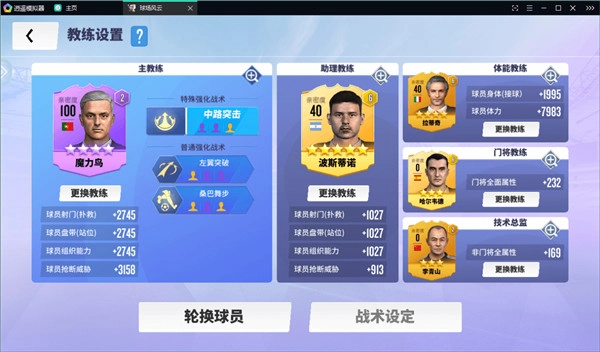 教练设置界面包含主教练的战术配置选项,以及助理教练、体能教练、门将教练和技术总监的相关设置项。在这些内容的下方是