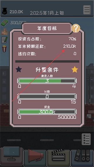 这是年度目标界面,需要完成投资方占股、年末还款等目标,同时达成升星条件以运营制片厂。