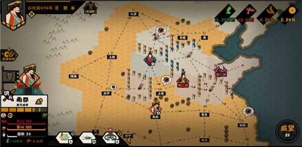 当然啦,在兵力数量有了一定增长后,也得记得给他们更新装备配置。打下两座城池后就能获得青铜,把青铜用在铜甲和武器的研究上,能让兵力的战斗力更上一层楼哦。要是还有多余的资源,建议优先研究政治和民生方面的内容。