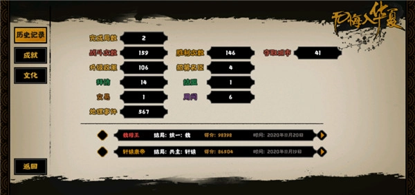 游戏里用模糊人物脸部的手法,为玩家营造出烟尘朦胧的美感,这也与游戏开篇“我”恍若在梦境与现实间来到山海界的设定相呼应。游戏的UI设计和各场景的BGM都巧妙融入了中华元素,整个游戏宛如一幅徐徐展开的山水画,色彩搭配精妙,洋溢着浓郁的古典韵味。不同时代都配有专属的背景音乐,时而慷慨激昂,时而典雅厚重,玩家在游玩过程中也能受到历史文化的熏陶。不过有两处小遗憾:一是战斗场景的BGM略显单一,二是士兵短兵相接时缺少击鼓振气的过渡动画。
